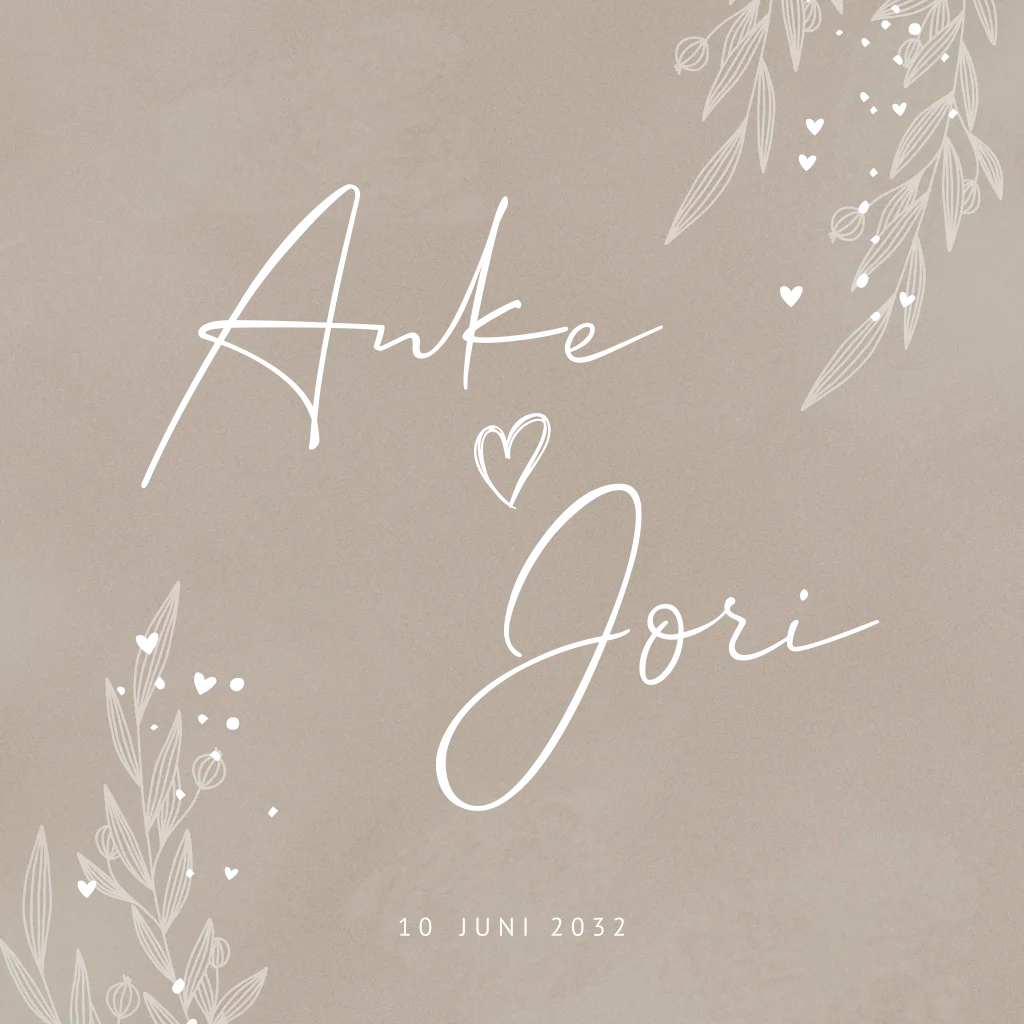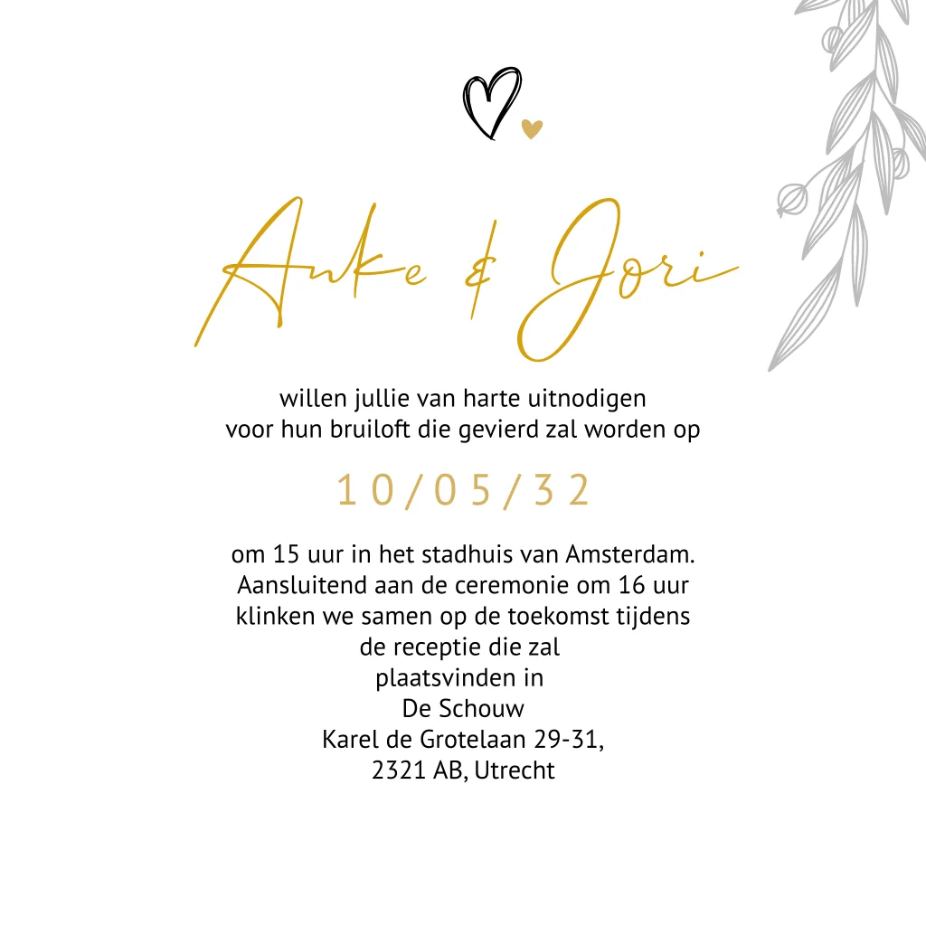 Trouwkaart zandkleur met takjes en goudfolie, prachtige stijlvolle kaart met aanpasbare teksten.