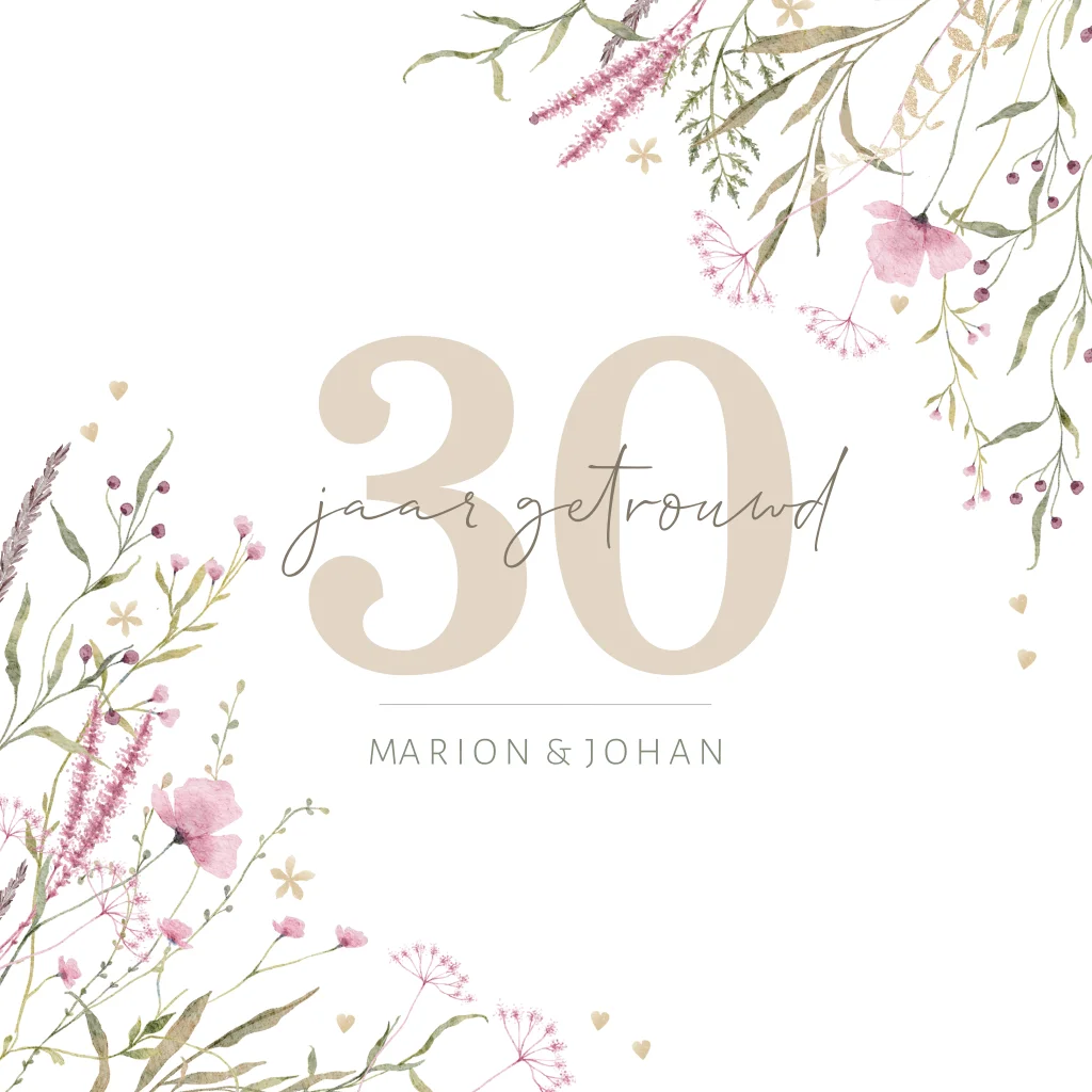 Uitnodiging jubileum 30 veldbloemen met hartjes en takjes