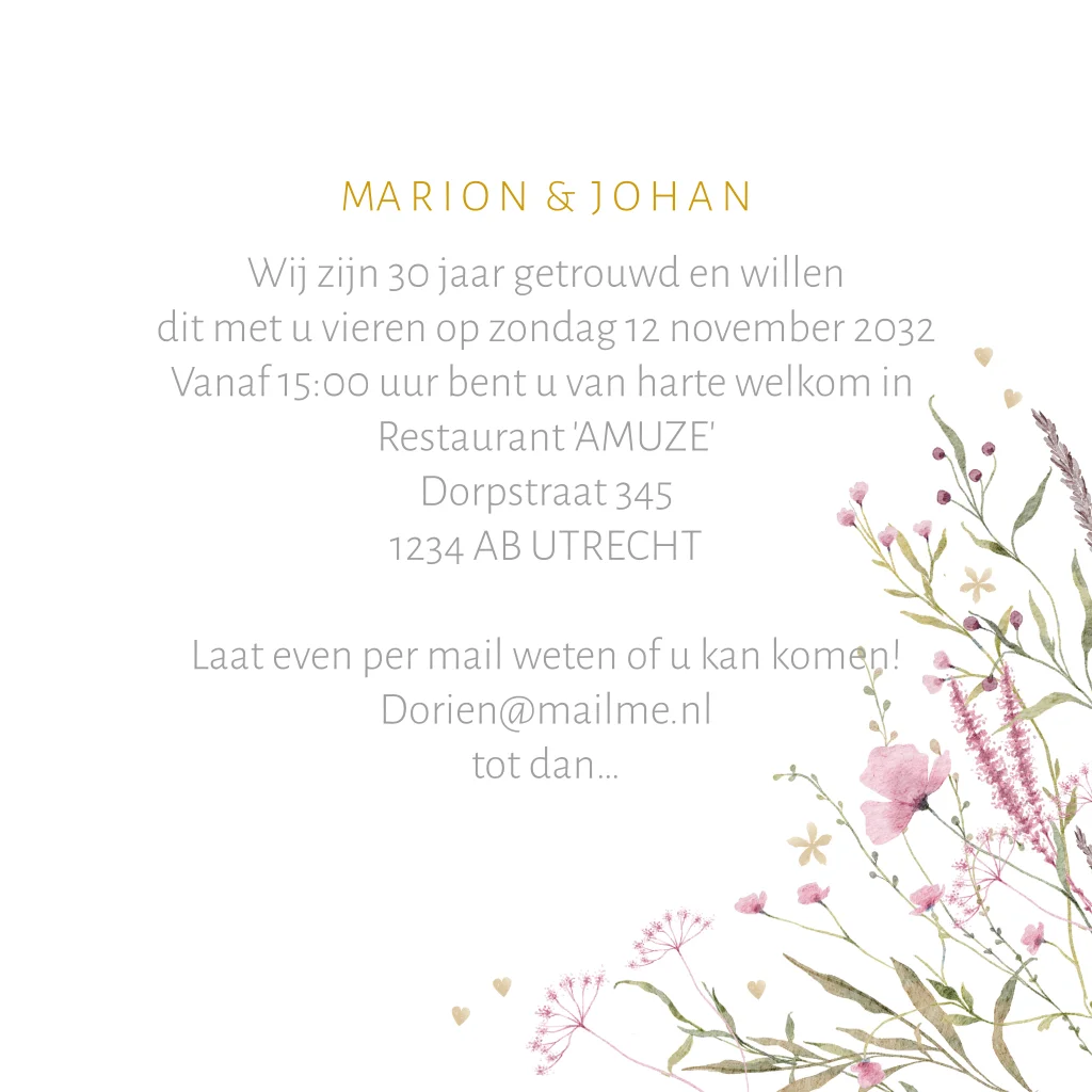 Uitnodiging jubileum veldbloemen met hartjes en takjes. Wanneer je 30 jaar getrouwd bent, is het tijd voor een groots jubileum. Een goede manier om dit te vieren is met een chique jubileumkaart. Onze uitnodiging jubileum veldbloemen met hartjes is perfect voor een paar dat van bloemen houdt. De kaart is stijlvol en klassiek, met een mooie aquarel bloem en gouden hartjes.