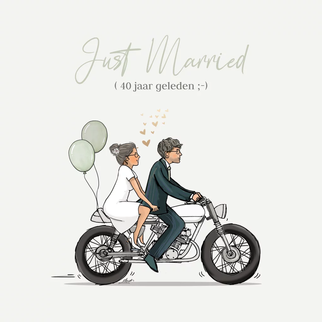 Uitnodiging jubileum bruidspaar op motor, origineel en leuk! Wil je eventueel andere haarkleur, mail ons dan!
