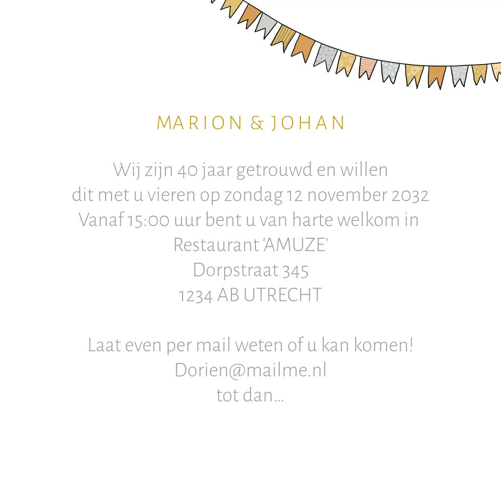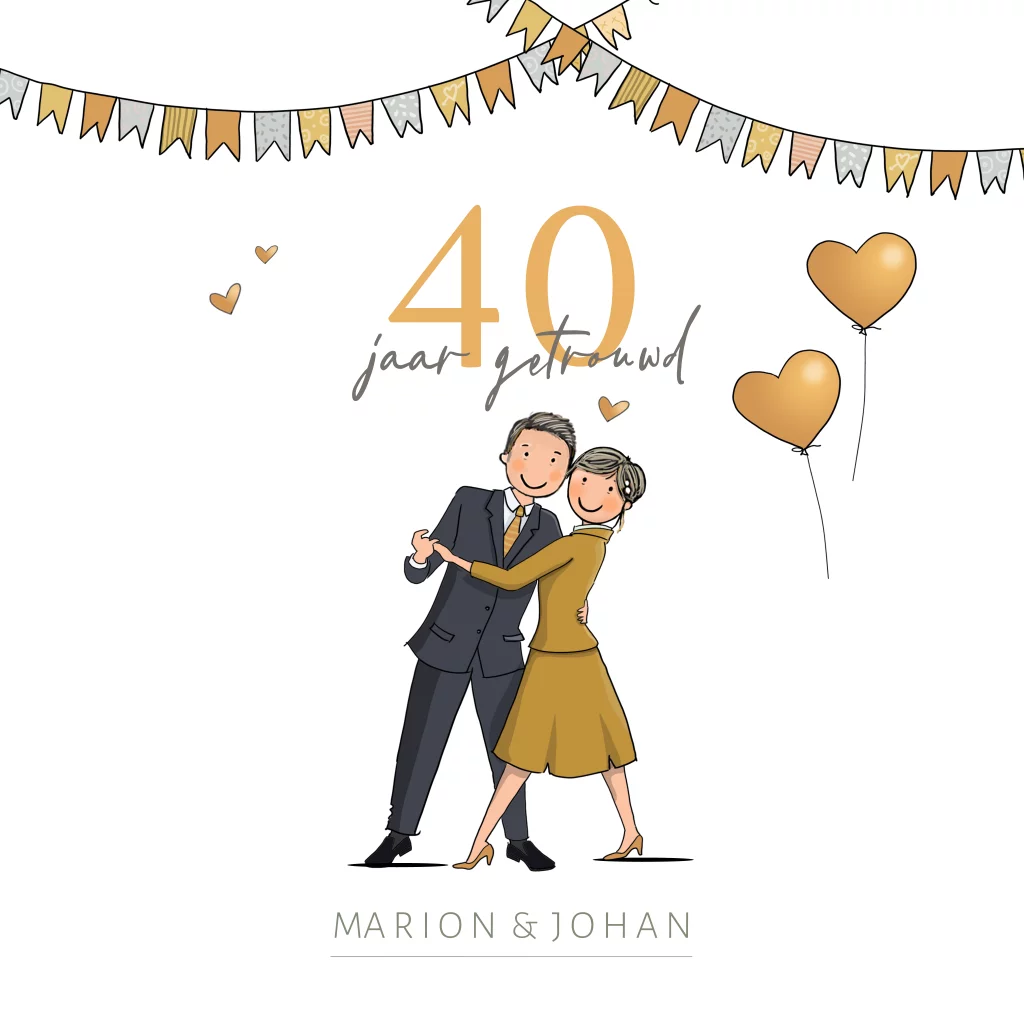 Uitnodiging jubileum trouwstel goudlook. Wanneer je 40 jaar getrouwd bent, is het tijd voor een groots jubileum. Een goede manier om dit te vieren is met een chique jubileumkaart. Onze uitnodiging jubileum veldbloemen met hartjes is perfect voor een paar dat van bloemen houdt. De kaart is stijlvol en klassiek, met een mooie aquarel bloem en gouden hartjes.