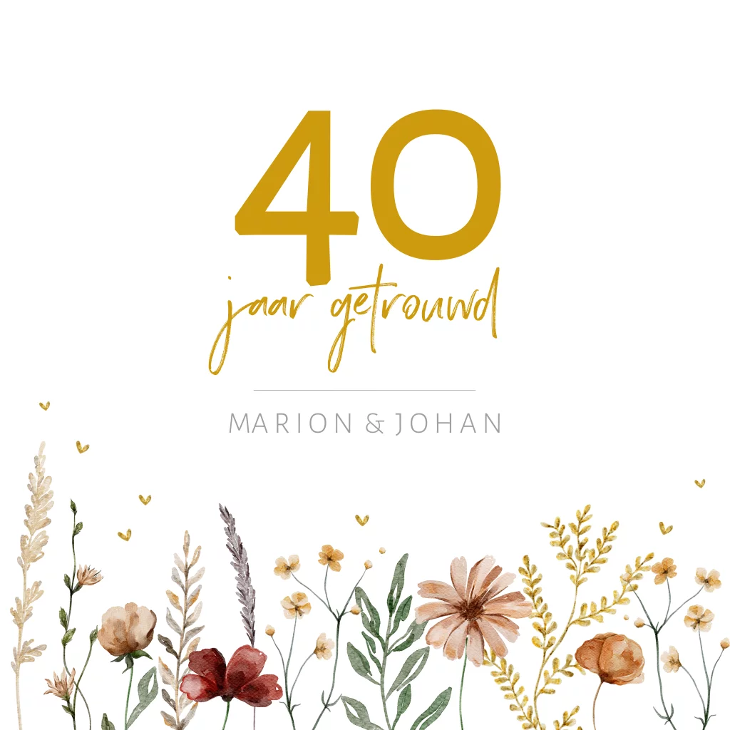 Uitnodiging jubileum veldbloemen met hartjes Wanneer je 40 jaar getrouwd bent, is het tijd voor een groots jubileum. Een goede manier om dit te vieren is met een chique jubileumkaart. Onze uitnodiging jubileum veldbloemen met hartjes is perfect voor een paar dat van bloemen houdt. De kaart is stijlvol en klassiek, met een mooie aquarel bloem en gouden hartjes.