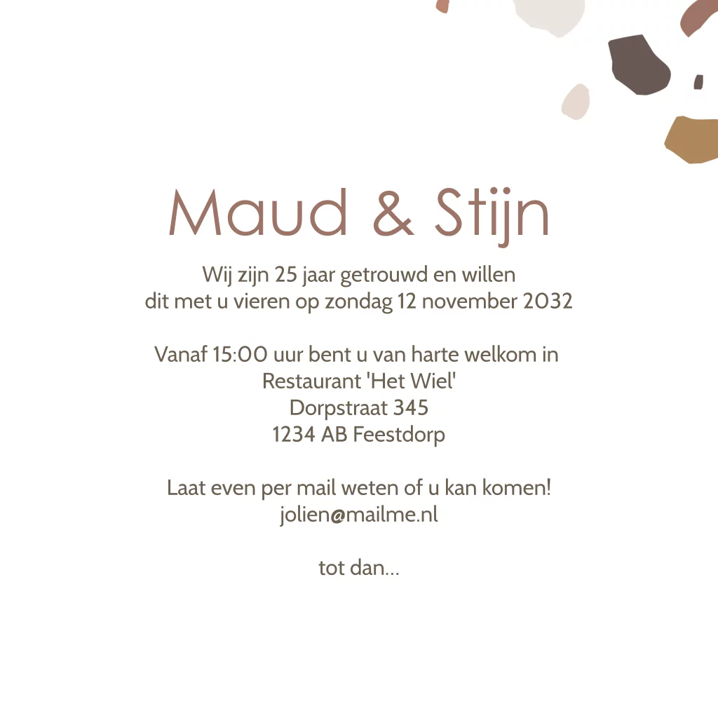 Uitnodiging terrazzo bruin grijs met foto en aanpasbare teksten. Wat een prachtige kaart.