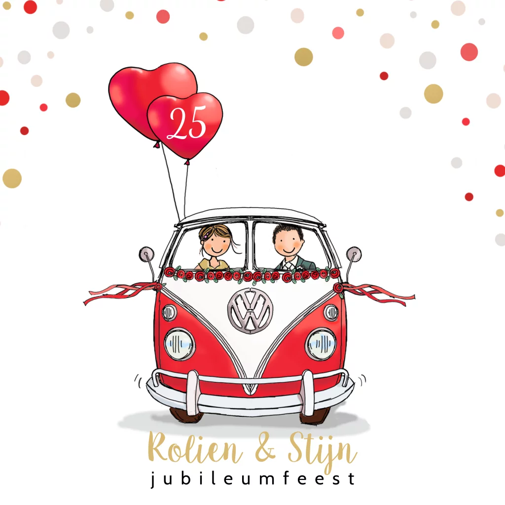 Jubileumkaart vw busje rood met ballonnen