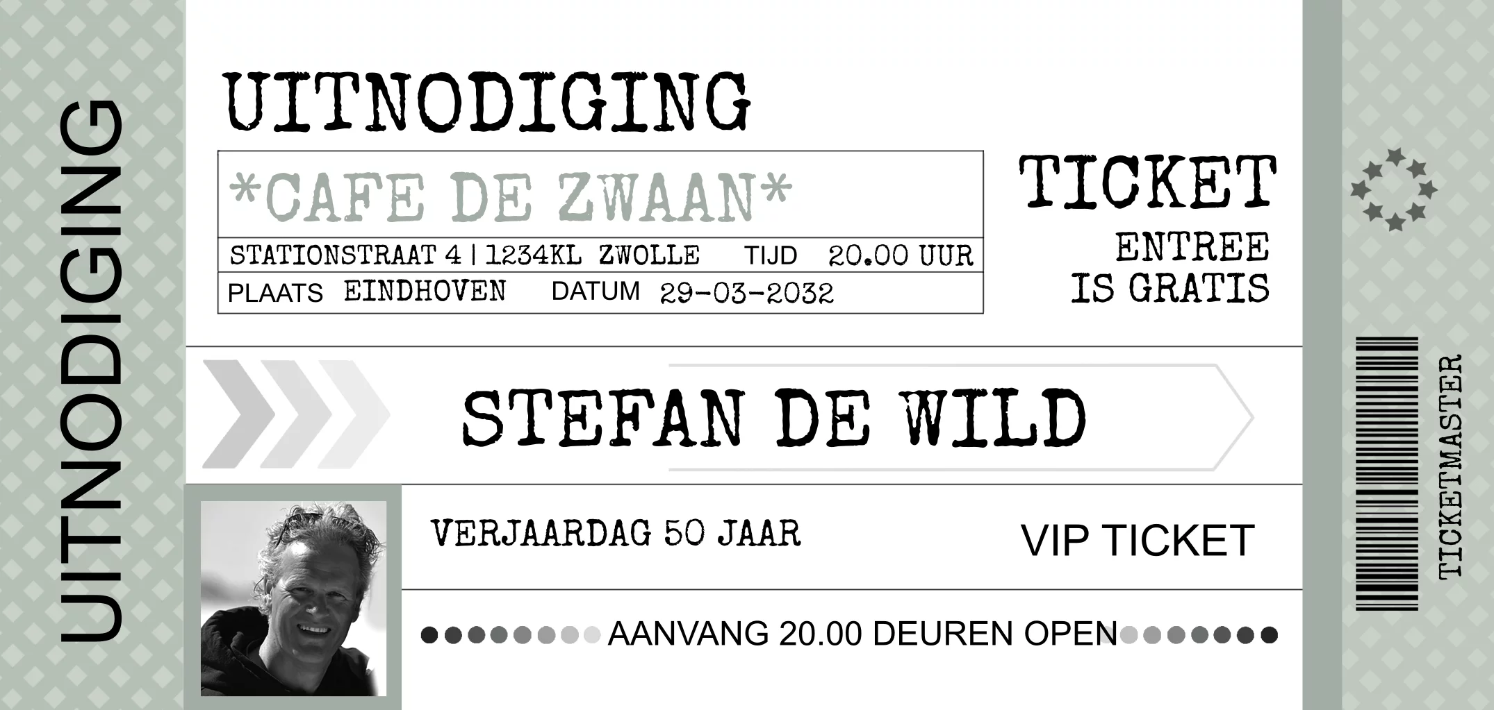 Uitnodiging ticket grijsgroen met teksten