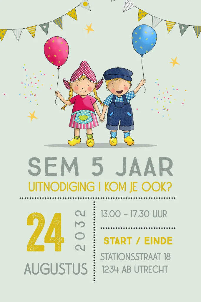 Kinderfeestje uitnodigingen voor Fien en Teun zijn nu verkrijgbaar in een fantastisch groene kleur! Deze uitnodigingen zijn perfect voor een kinderfeestje en zullen zeker de aandacht trekken van alle gasten. De uitnodigingen zijn voorzien van toeters, een slinger, een vogel en een grappige tekst. Dit maakt de uitnodigingen leuk en kleurrijk. De uitnodigingen zijn eenvoudig te bestellen via de website en worden snel geleverd. Zo kun je snel en eenvoudig je kinderfeestje inplannen en hoeven de ouders zich geen zorgen te maken over de uitnodigingen.