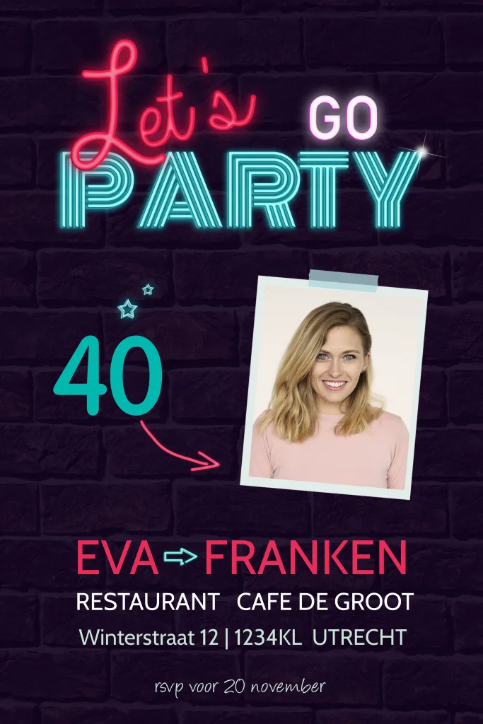 Uitnodiging neon letters met foto, foto is naar wens aanpasbaar.