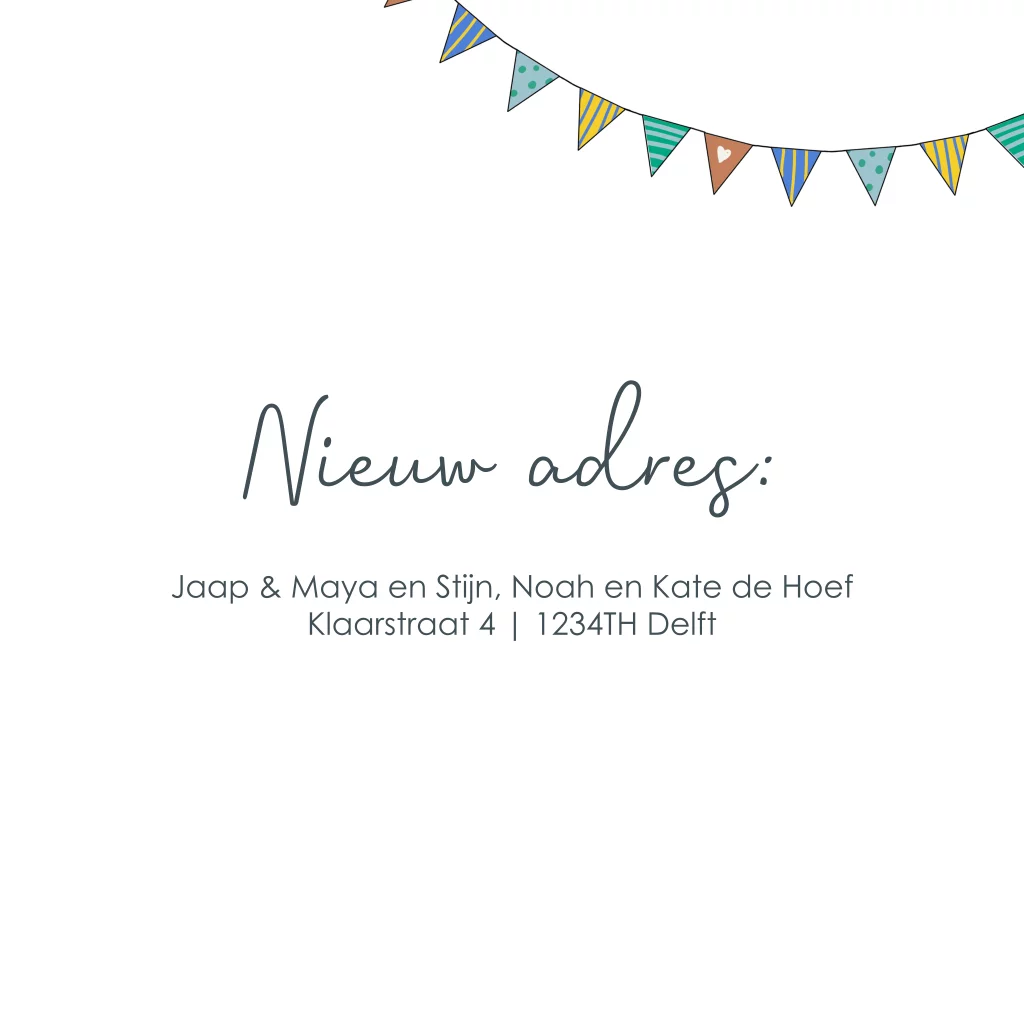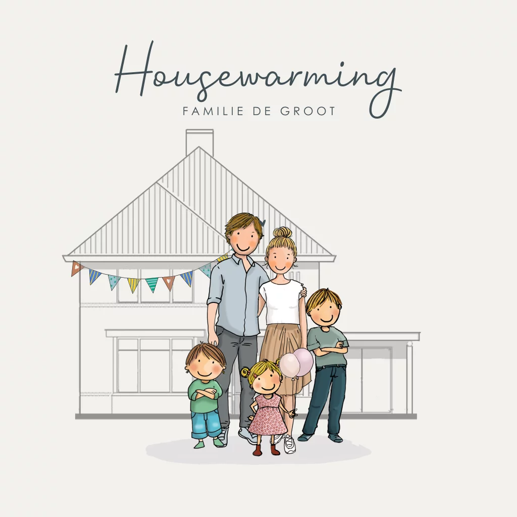 Housewarming kaart met gezin en huis, in de clipart staan leuk getekende ouders en kinderen klaar om zo je kaart helemaal naar wens te maken.