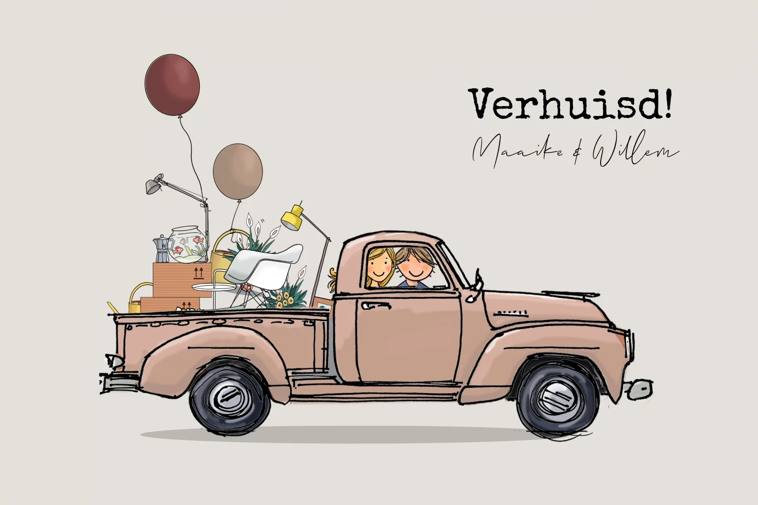 Verhuiskaart auto pick up beige, poppetjes en hond zijn aanpasbaar.