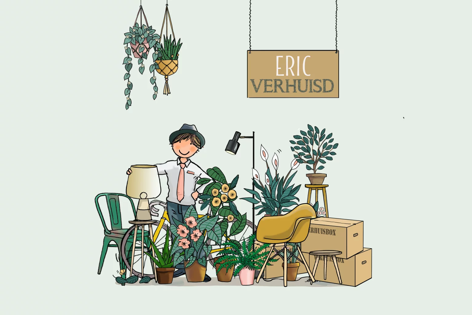 Verhuiskaart man met meubels, planten, lampen, stoelen en dozen